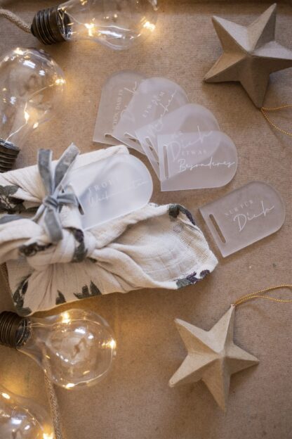 Ein hübscher Anhänger für deine Weihnachtsgeschenke. Mit hübschen Sprüchen oder mit dem Namen personalisiert. Du kannst die Anhänger auch perfekt als Dekoration der Servietten bei einer Festtagstafel nutzen. An Weihnachten oder anderen Festlichkeiten ein Hingucker für deine Gäste.