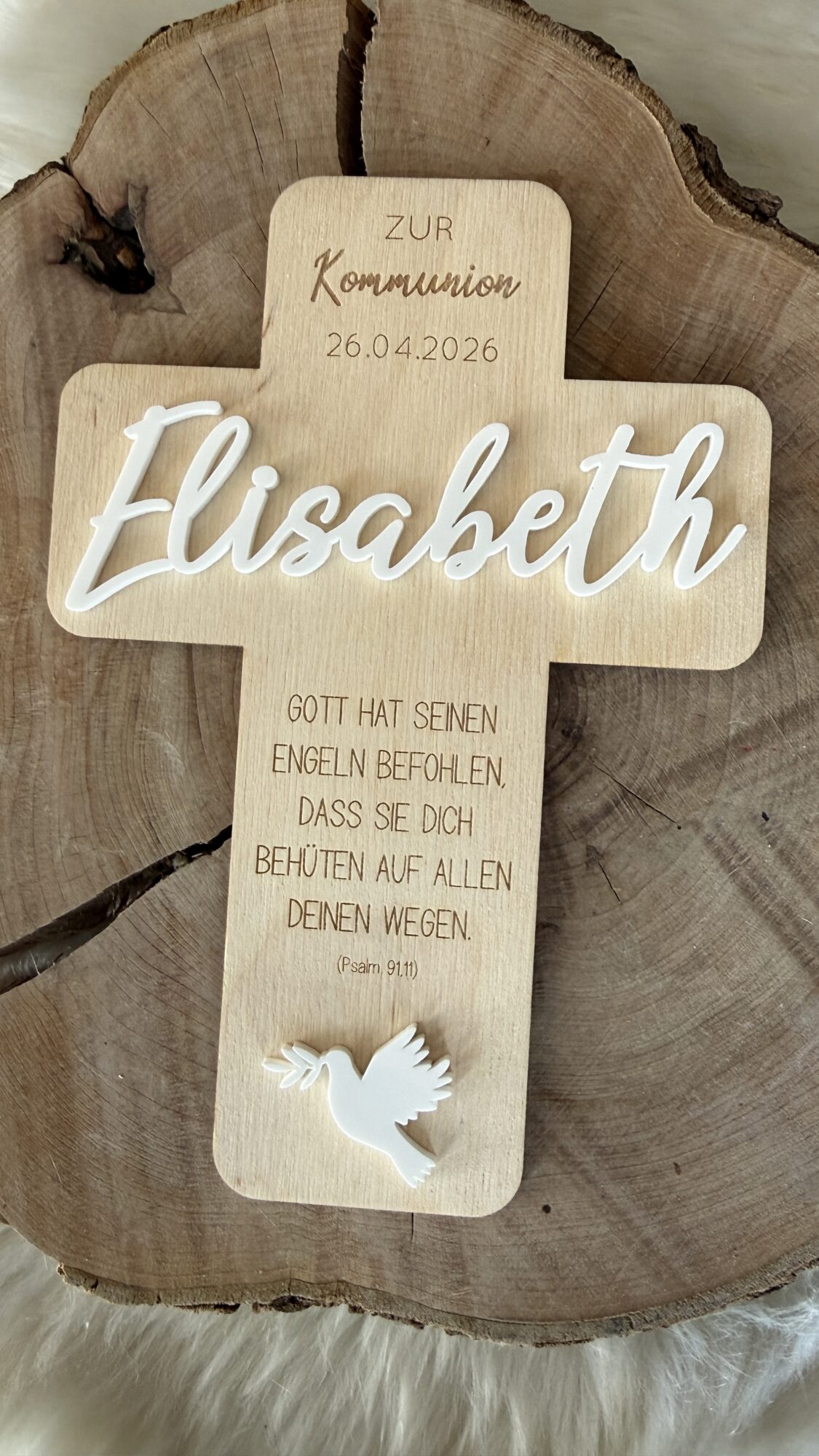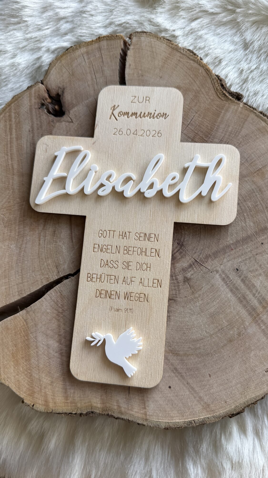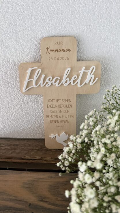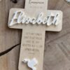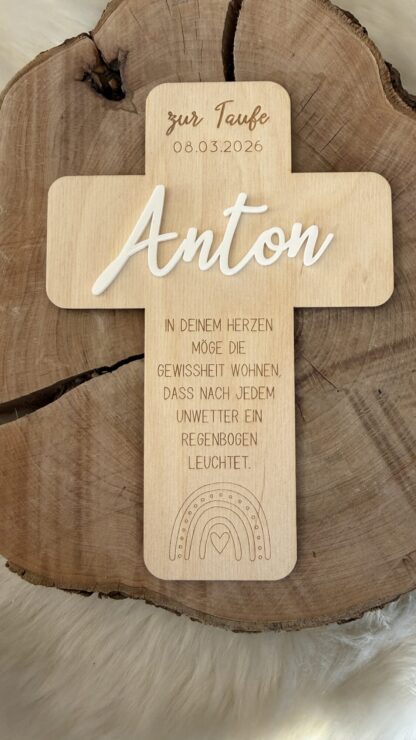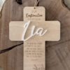 Jedes Kreuz wird mit „zur Taufe“, „zur Konfirmation“ oder „zur Kommunion“ und dem Datum graviert. Als Highlight wird der Name aus Acryl angebracht. Dieses Kreuz ist ideal als Geldgeschenk und Deko im Kiderzimmer.