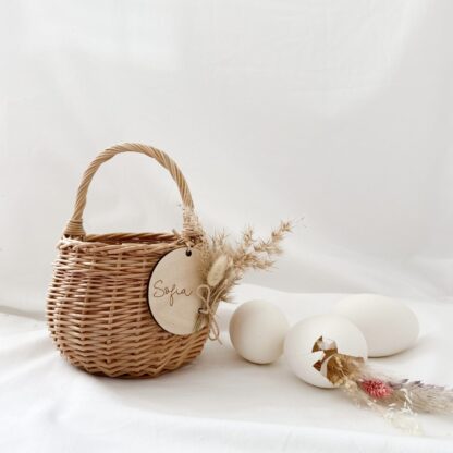 Osterhase kann kommen! Mit diesem Osterkörbchen aus Weide wird das Eiersuchen zu einem mega Spaß. Perfekt für die kleinen Kinderhändchen. Ein süßer Hase oder ein Blumenkranz und der Name deines Lieblings werden auf dem Anhänger graviert. Die Anhänger kannst du auch wunderbar als Geschenkanhänger oder zum Servietten-Falten nutzen.
