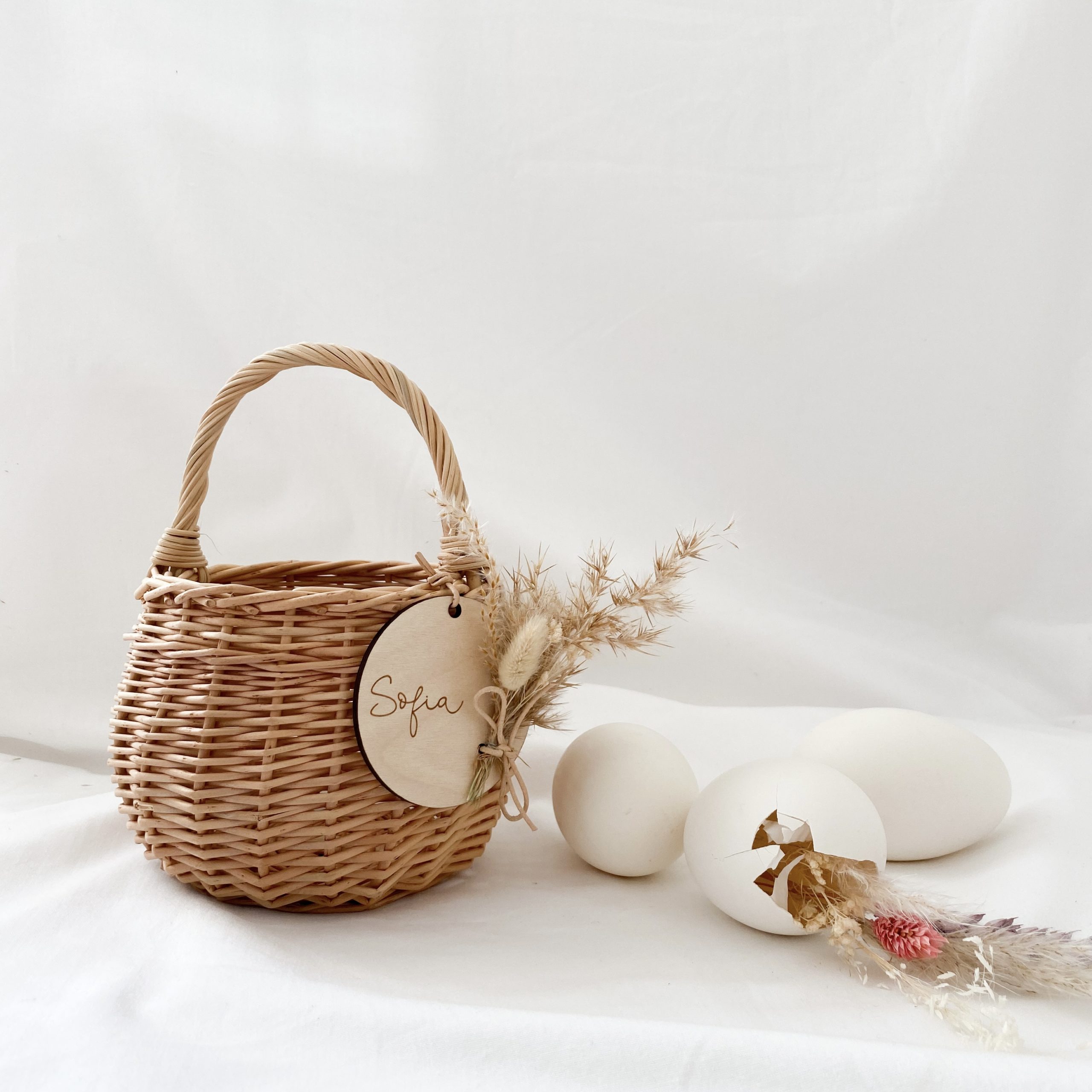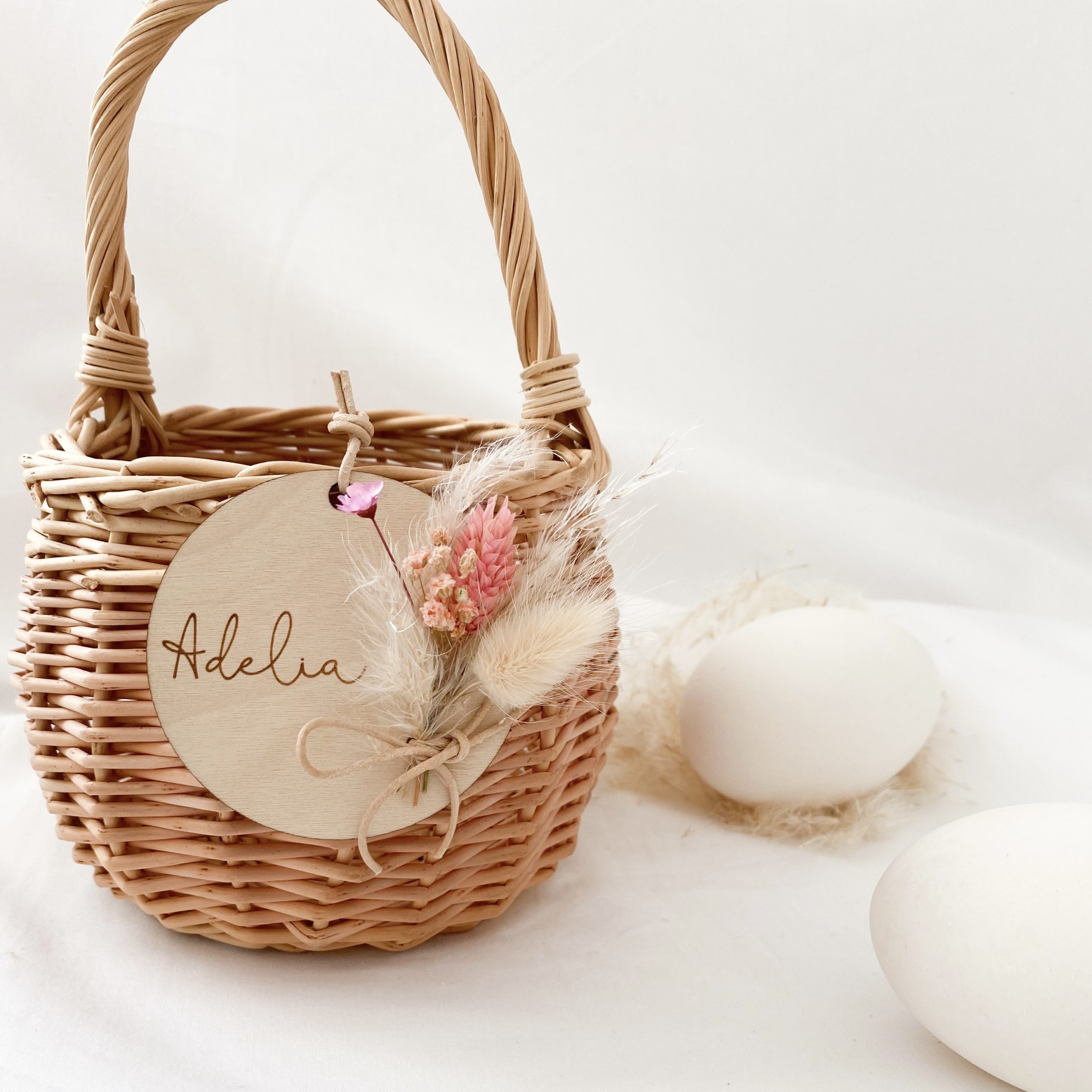 Osterkörbchen inkl. Anhänger und Trockenblumen rund personalisiert